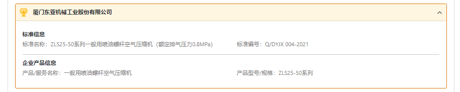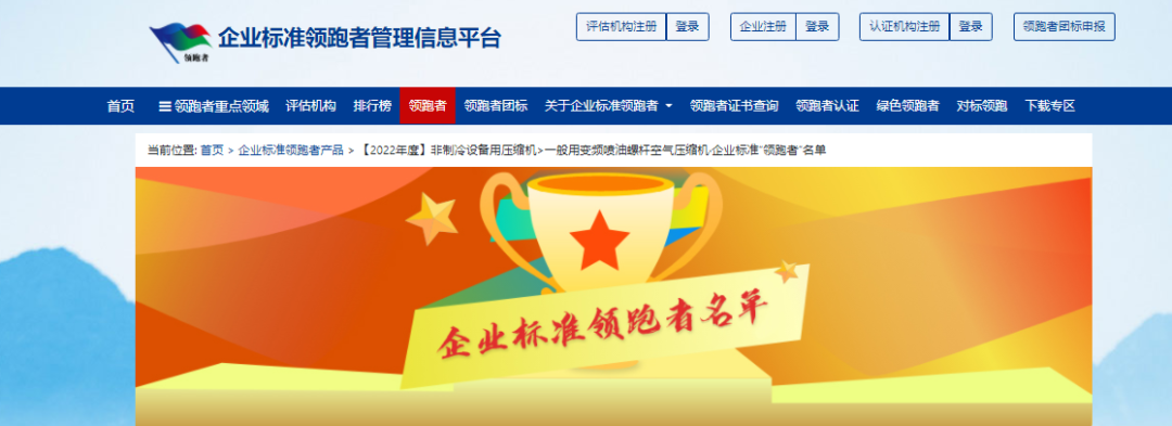 近日,企業(yè)標(biāo)準(zhǔn)領(lǐng)跑者管理信息平臺頒布了【2022年度】非制冷設(shè)備用壓縮機·企業(yè)標(biāo)準(zhǔn)“領(lǐng)跑者”名單,捷豹永磁螺桿機再一次成為認(rèn)證的能效“領(lǐng)跑者”。