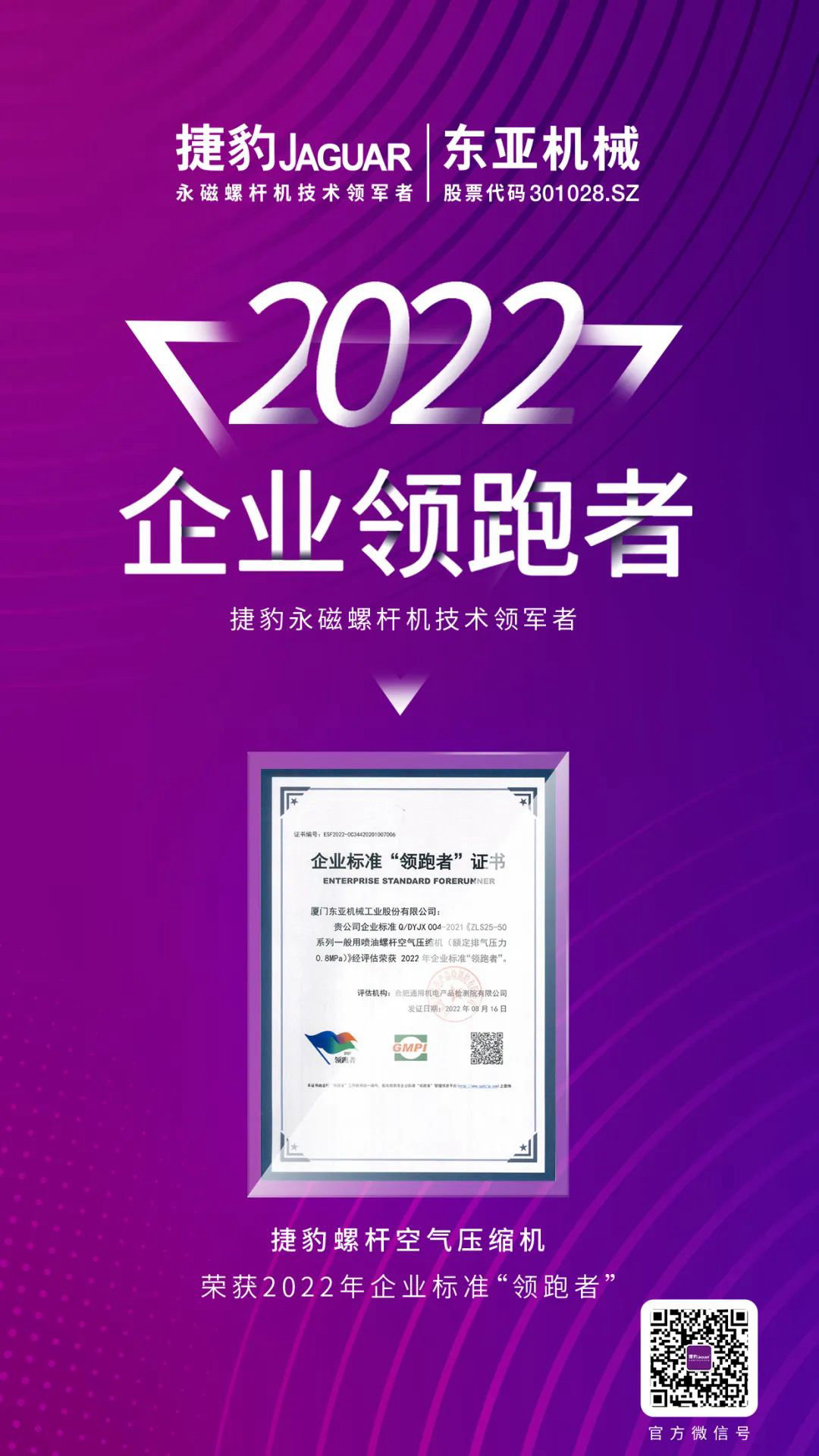 捷豹空壓機,2020年——2022年連續(xù)三年榮膺上榜企業(yè)標(biāo)準(zhǔn)“領(lǐng)跑者”,彰顯了捷豹空壓機在行業(yè)領(lǐng)域內(nèi)的先進(jìn)性、創(chuàng)新性。